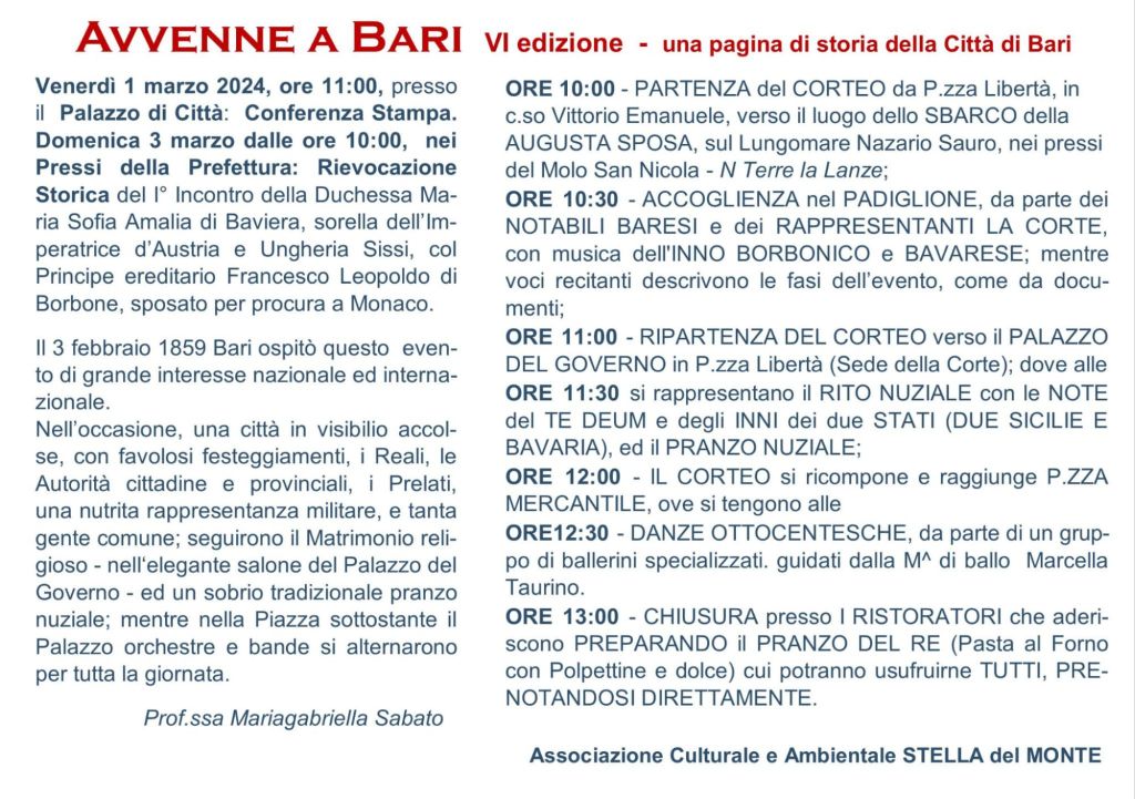 Una pagina di storia della Città di Bari che per il sesto anno rivive a cura dell’Associazione Stella del Monte con la collaborazione di altri soggetti tra cui la Fondazione FRANCESCO II DELLE DUE SICILIE .
