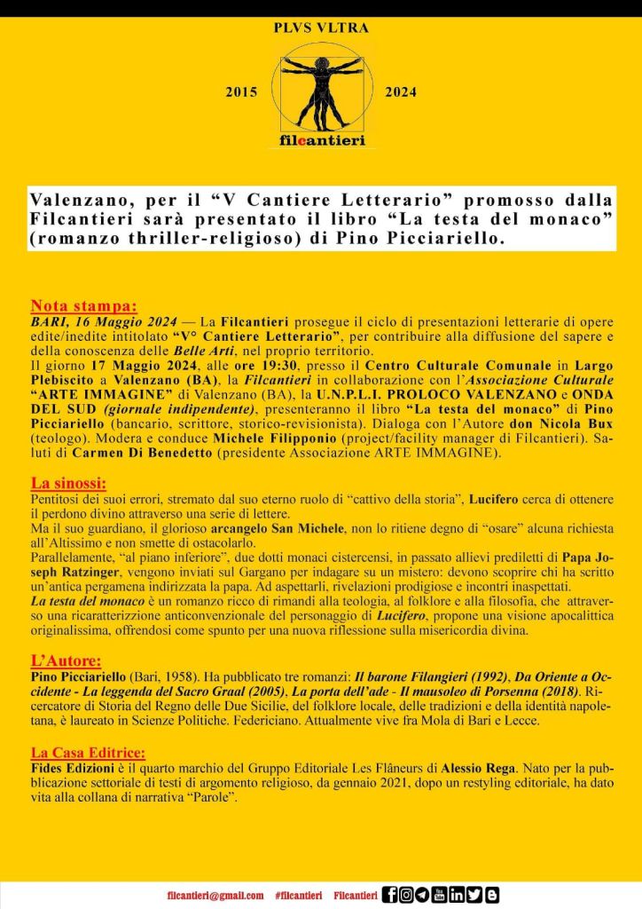 La Filcantieri peril “V Cantiere Letterario”presenta a Valenzano il libro “La testa del monaco” di Pino Picciariello.