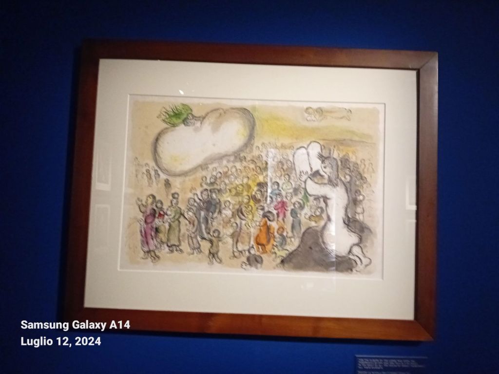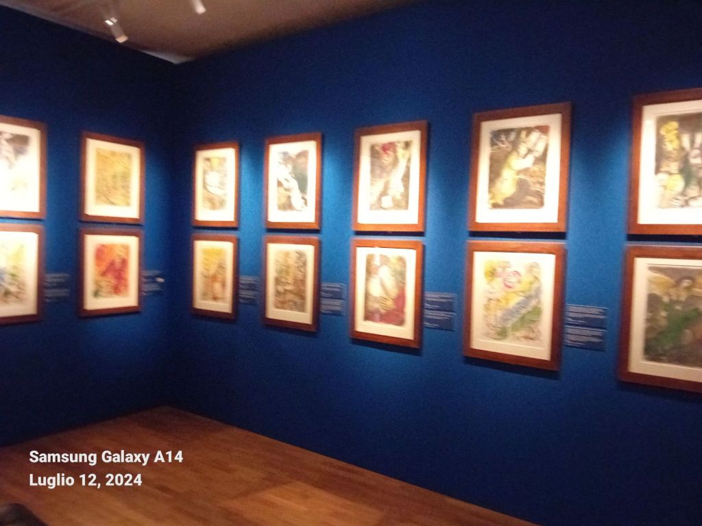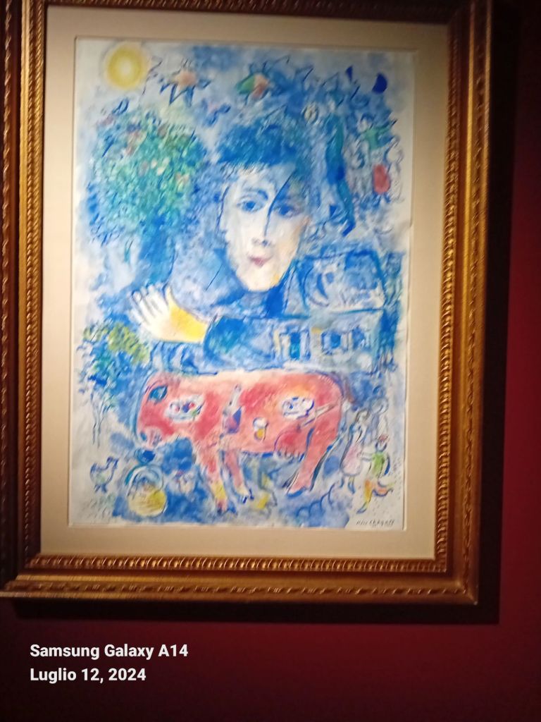 Il tema dominante della mostra- che abbraccia il lungo arco di vita dell’artista dal 1925 sino alla sua morte e le cui opere provengono da collezioni private e quindi poco accessibili al grande pubblico- è quello dell’amore che lega Chagall alla moglie Bella, alla religione, alla patria, all’arte, al mondo delle favole.