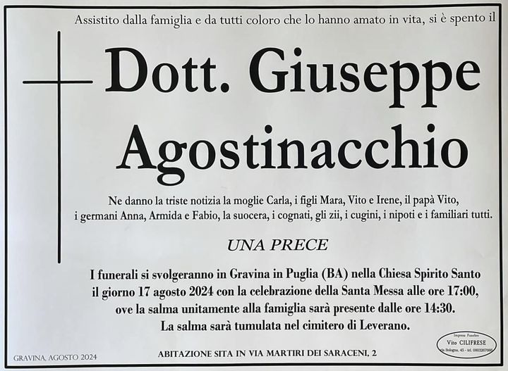 Oggi, la comunità gravinese è unita nel dolore. I social si sono riempiti di messaggi di cordoglio per la famiglia Agostinacchio, da parte di pazienti, amici, conoscenti e anche di chi non ha mai avuto l’onore di conoscere personalmente Giuseppe, ma che è stato toccato dalla sua storia. Come redazione, ci uniamo al lutto di tutta la città di Gravina in Puglia, con la speranza che la figlia di Giuseppe possa trovare la forza di sopravvivere e tornare a casa, dove l’amore e l’affetto della sua famiglia e della comunità saranno il sostegno più grande.