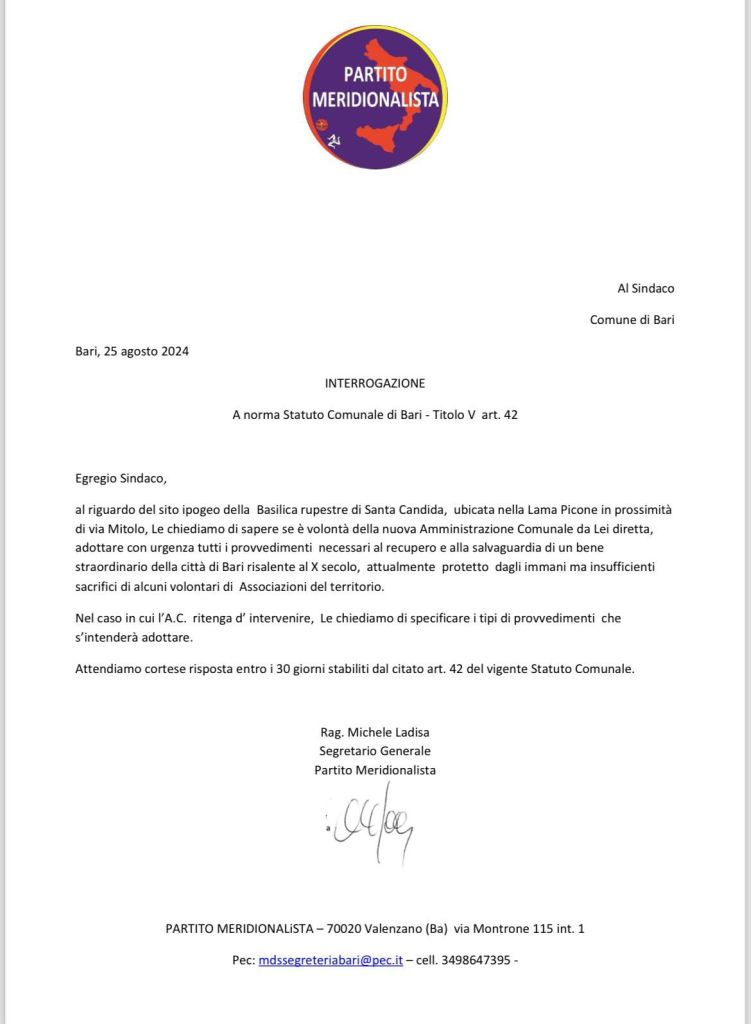 Il Partito Meridionalista presenta un interrogazione all’amministrazione comunale di Bari sulla salvaguardia del sito ipogeo della basilica di Santa Candida a Bari.