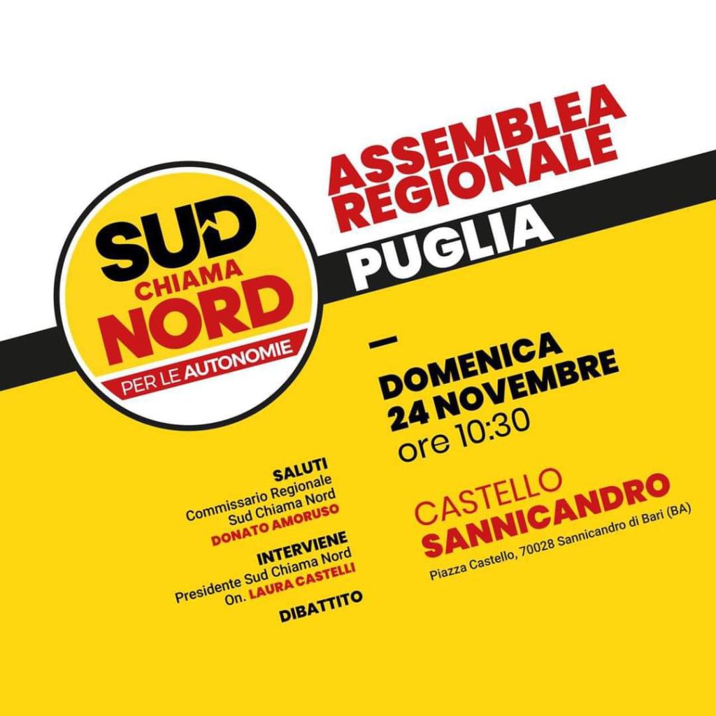 Domenica 24 novembre si è svolta l’assemblea regionale in Puglia ,presso il salone del castello di Sannicandro di Bari, del movimento Sud chiama Nord di Cateno De Luca.