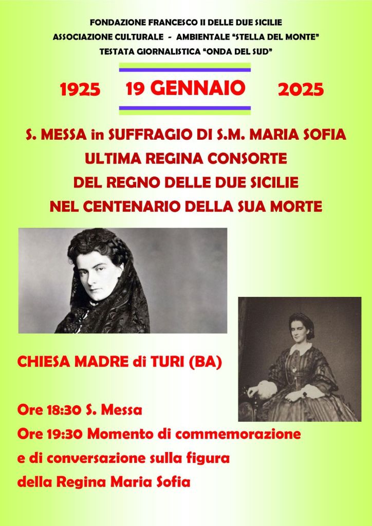 In occasione del centenario della morte é stata celebrata, a cura della Fondazione Francesco II Delle Due Sicilie,l’ Associazione culturale -ambientale” Stella del Monte” e la testata Giornalistica Onda del Sud,una messa in suffragio di Maria Sofia -officiata da Don Luciano Rotolo presidente della Fondazione Francesco II delle Due Sicilie-presso la Chiesa Madre di Turi(Ba)a cui è seguita ,a cura di Don luciano Rotolo, un momento di commemorazione e conversazione sulla figura di Maria Sofia.