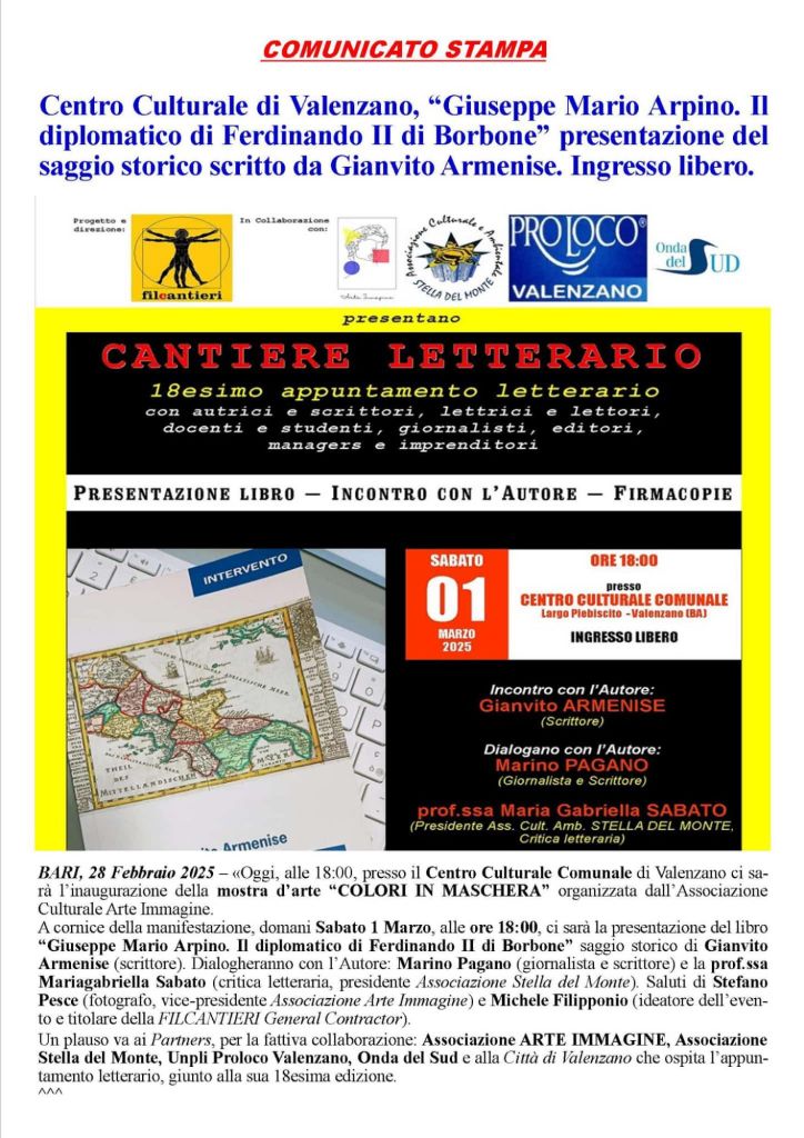 Questa sera,sabato 1 Marzo ore 18,00 ,il Centro Culturale di Valenzano presenta uno spaccato della storia del Regno delle Due Sicile con il saggio storico scritto da Gianvito Armenise “Giuseppe Mario Arpino.Il diplomatico di Ferdinando II di Borbone”. (Edizioni Solfanelli)