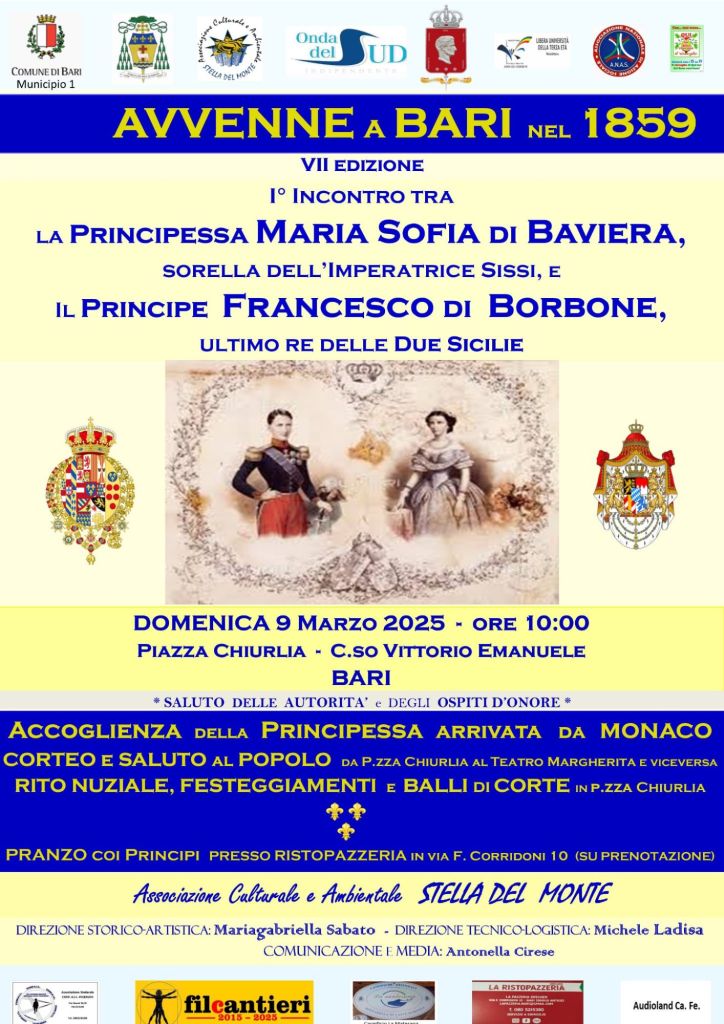 La rievocazione storica del primo incontro ,avvenuto nel 1859,della duchessa Maria Sofia di Baviera con il principe ereditario Francesco di Borbone,divenuto poi l’ultimo re delle Due Sicilie,”Avvenne a Bari” a cura della professoressa Mariagabriella Sabato,presidente dell’Associazione Stella del Monte,giunge alla VII edizione e domenica 9 marzo,la città di Bari ha rivissuto per le strade del centro l’evento di rilevanza,nazionale ed internazionale,che vide oltre 160 anni fa la nostra città accogliere con festeggiamenti la coppia reale il cui matrimonio religioso si svolse nel salone del Palazzo del Governo .