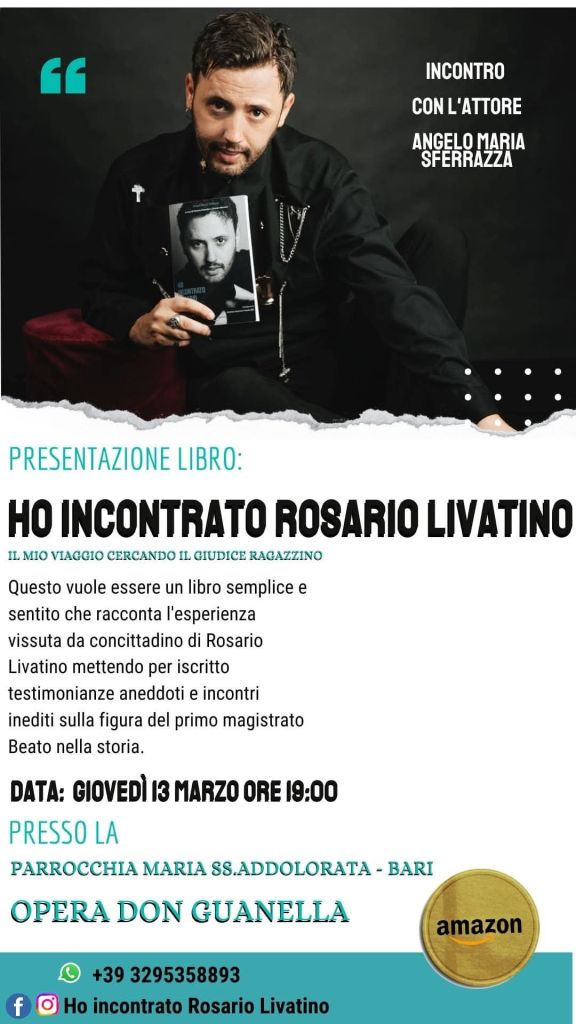 L’attore siciliano Angelo Maria Sferazza autore del libro “Ho incontrato Rosario Livatino”a cura di Simona Schembri e Daniela Marasco -edito da Amazon publishing – ha ripreso con entusiasmo il tour del libro ripartendo dalla nostra Puglia ed è stato ospite presso la Parrocchia Maria SS.Addolorata -Bari.Opera Don Guanella.