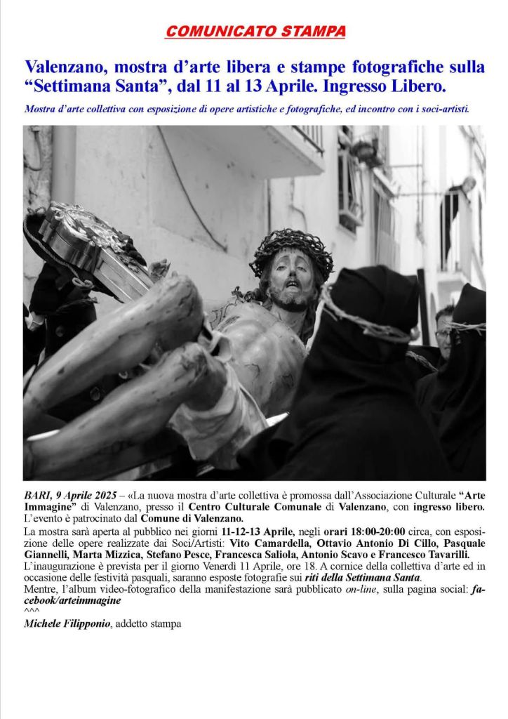 Redazione La mostra è promossa dall’Associazione culturale “Arte e Immagine” di Valenzano presso il Centro Culturale Comunale di ValenzanoL’evento è patrocinato dal Comune di Valenzano.