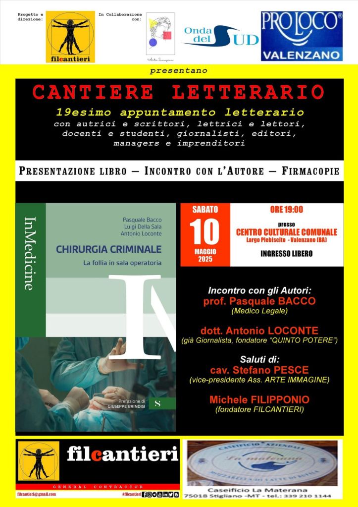 Torna il 19esimo appuntamento letterario del Cantiere letterario promosso da Filcantieri, Associazione culturale Arte e Immagine, la testata giornalistica web” Onda del Sud” e la Proloco di Valenzano.