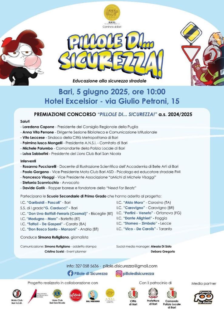 L’hotel Excelsior-via Giulio Petroni a Bari-ospita giovedì 5 giugno 2025 ore 10,00, la premiazione del concorso “PILLOLE DI…SICUREZZA! Educazione alla sicurezza stradale” as2024/2025.