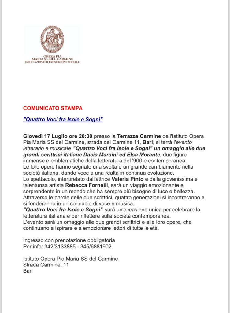 Giovedì 17 luglio 2025 ore 20,30 presso la Terazza del Carmine dell’istituto Opera Pia Maria SS. del Carmine a Bari si terrà l’evento letterario musicale”Quattro voci fra isole e sogni”,un omaggio alle due grandi scrittrici Dacia Maraini ed Elsa Morante con Rebecca Fornarelli(chitarra e voce) e Valeria Pinto(voce recitante)
