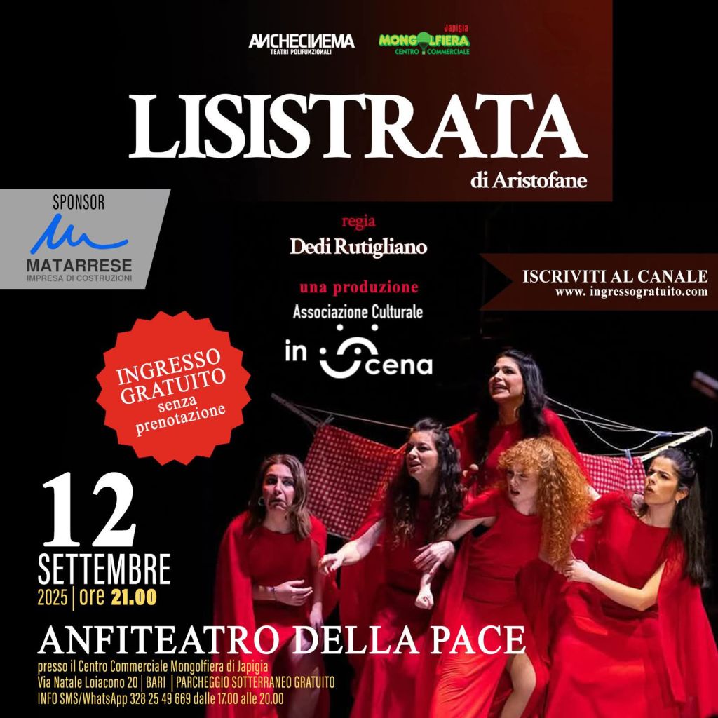 Lo spettacolo -promosso da AncheCinema in sinergia con l’associazione culturale Inscena ed il centro Commerciale la Mongolfiera e sponsorizzato da Matarrese Impresa di costruzioni -grazie alla regia di Dedi Rutigliano e alla spigliata e vivace recitazione di Sveva Calabrese,Giuseppe Desario, Giuseppe Giannelli,Giorgia Scialpi, Roberto Stasi,Giovanna Strambelli, Alessandra Turi e Rossella Viesti, ha coinvolto gli spettatori che hanno visto una versione del testo greco coerente con il tema originario della pace e dell’emancipazione femminile ma in una versione calata nell’attualità.