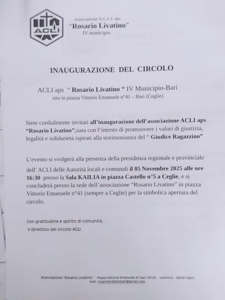 Mercoledi 5 novembre 2025 sarà ricordato come un giorno importante per Ceglie del Campo perchè segna la data di inagurazione di un nuovo Circolo Acli-dedicato al giudice ragazzino Rosario Livantino” simbolo di legalità e trasparenza”- che nasce sulla base di una concreta collaborazione e sinergia con le Istituzioni e le associazioni non solo per aiutare la comunità nel disbrigo delle varie pratiche burocratiche legate a pensioni, sanità, bonus ecc ma anche per promuovere la scoperta e rigenerazione del territorio cegliese attraverso l’attività e la cooperazione della popolazione che non deve essere soggetto passivo ma protagonista attivo di un sano civismo.