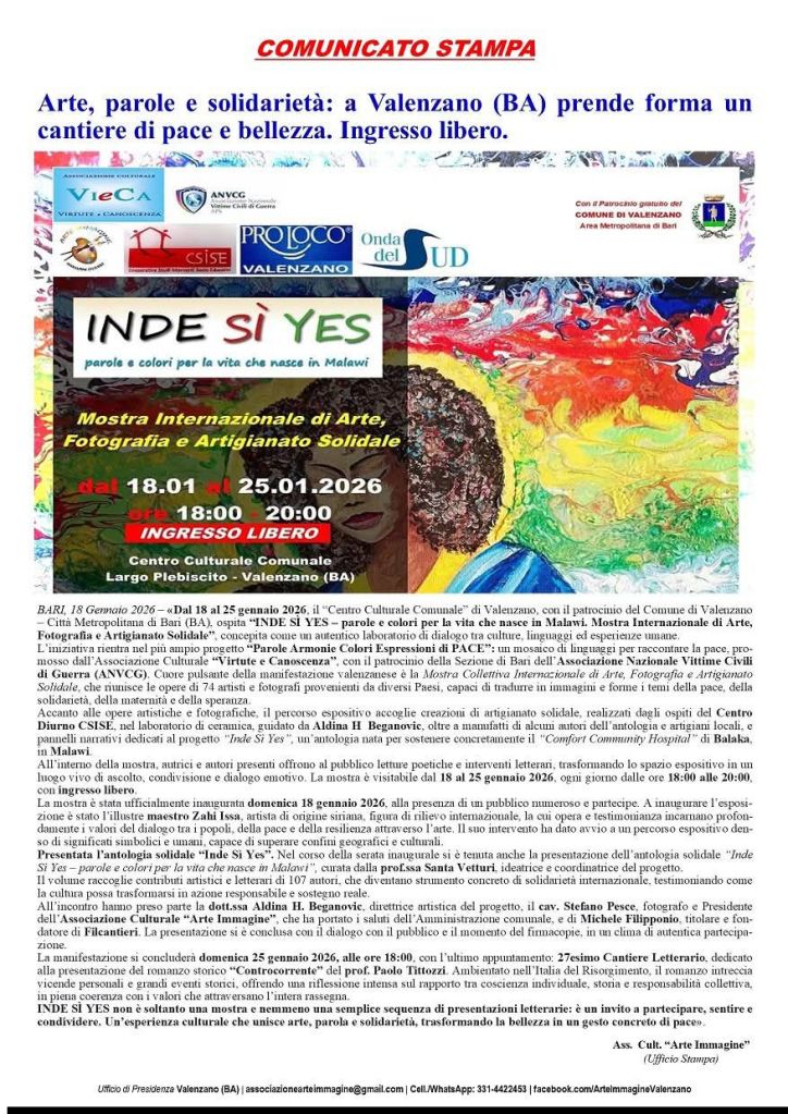 Dal 18 al 25 gennaio 2026 il “Centro Comunale “di Valenzano con il patrocinio del Comune di Valenzano-Citta’ Metropolitana di Bari(BA) ospita”Inde Si Yes-,parole e colori per la vita che nasce in Malawi-Mostra Internazionale di Arte,Fotografia e Artigianato Solidale” concepito come un autentico laboratorio di dialogo tra culture linguaggio ed esperienze umane.