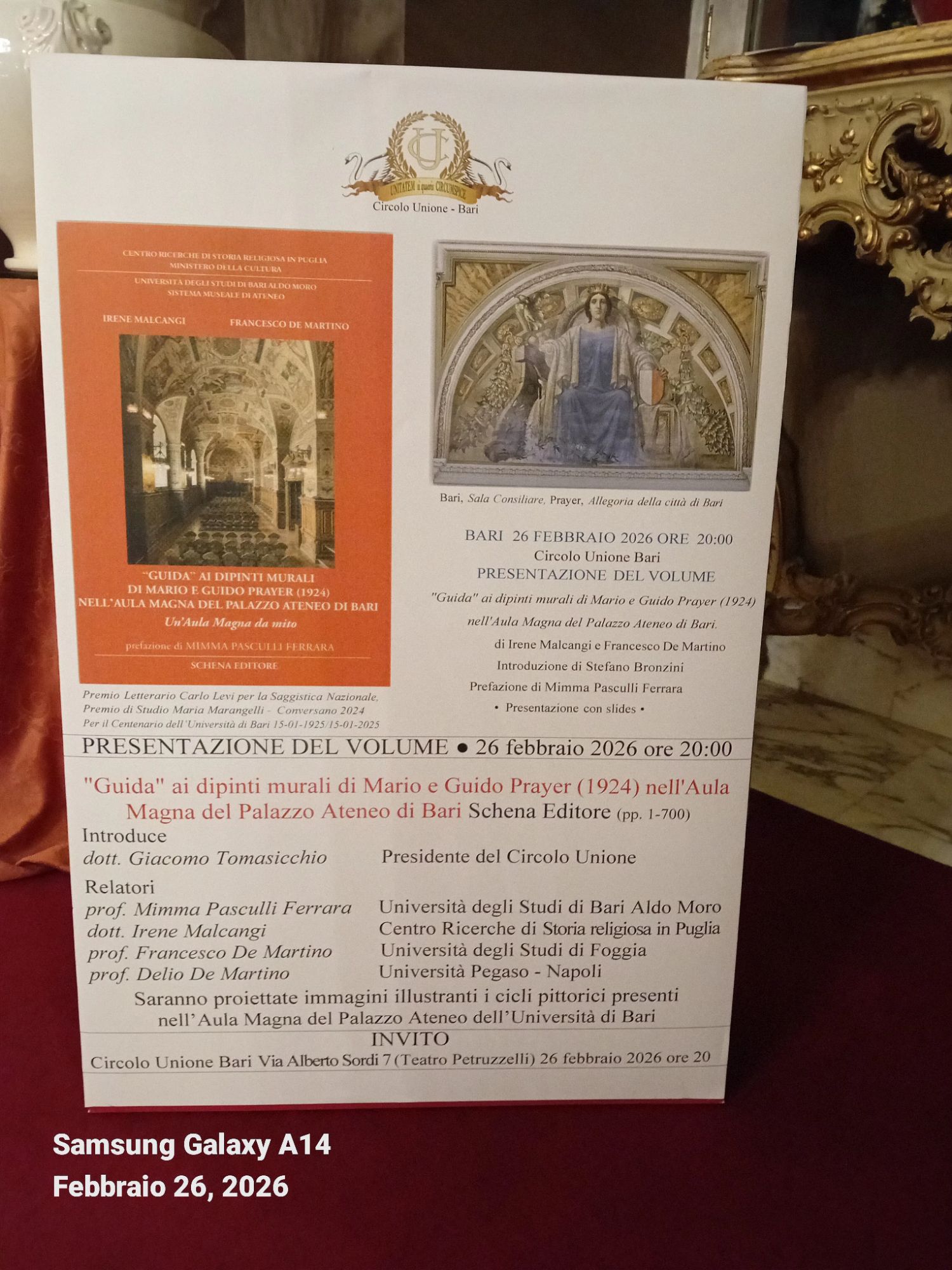 Il Circolo Unione Bari ha presentato il volume”Guida” ai dipinti di Mario e Guido Prayer (1924) nell’aula Magna del Palazzo Ateneo di Bari.